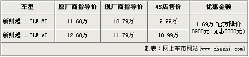 据北京别克经销店销售人员介绍,目前别克凯越只有1.6L手动舒适版以及1.6L自动舒适版两款车型在售,其他车型均已不再销售。别克对这两款在售车型进行了统一官降8900元,并且在经销店购车还可以得到8000元的现金优惠,两款车型的售价分别降到了9.99万元和10.99万元。销售人员还介绍,店内两款车型现车充足,消费者挑选的空间很大。