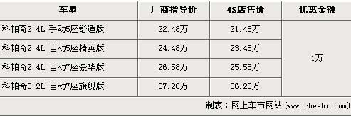 科帕奇车型分为2.4L与3.2L两种排量,2.4L手动五座舒适版和2.4L七座手自一体豪华版两款车型先期上市,2.4L 5座精英版和3.2L排量的车型随后也上市销售,全车系售价区间为22.48万元-37.28万元。近期根据网上车市价格监测显示,科帕奇2.4L车型全系优惠1万元,具体详情请看下表:
