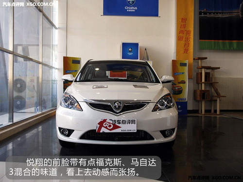 悦翔的前脸给我们的第一眼感觉是有点福克斯与马自达3的混合味道:X型的前脸极富有冲击力与动感;五边形的中网配上熏黑的三角形大灯,张扬而有攻击性,正对年轻消费者的胃口。