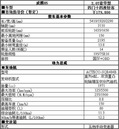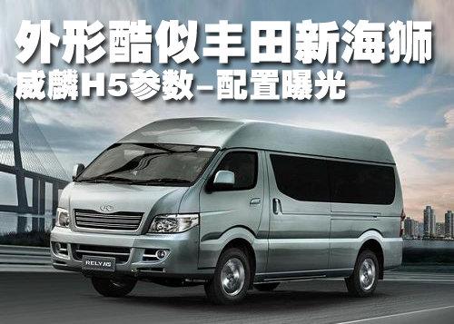 威麟H5是一款大型的中高级商务车,在外形上借鉴了著名的丰田新海狮的设计。这款新车将于3月26日正式上市,在上市前我们得到了威麟H5的部分参数和配置,2.0T豪华型预计售17.98万元。