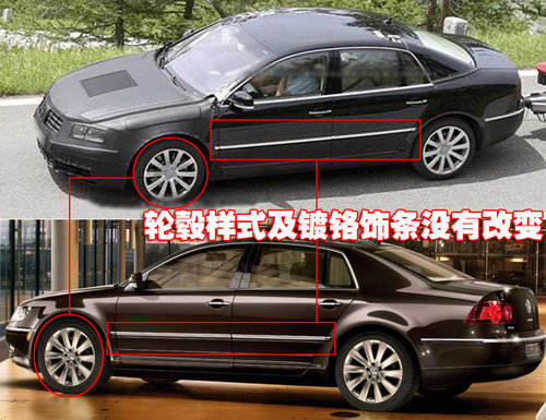大众新辉腾侧面线条与在售车型保持一致,贯穿的镀铬饰条设计依然出现在大众新辉腾的车身两侧。除此之外,10辐合金大尺寸轮毂依然没有改变。