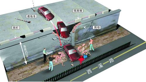 走进驾校场地,可以看到,学车的场地边有高约20厘米的围栏和更高更敦实的隔离墩。从现场看,肇事的教练车先是撞破了围栏和隔离墩,然后才撞破了围墙,飞到了落差达2米之下的人行道上。
