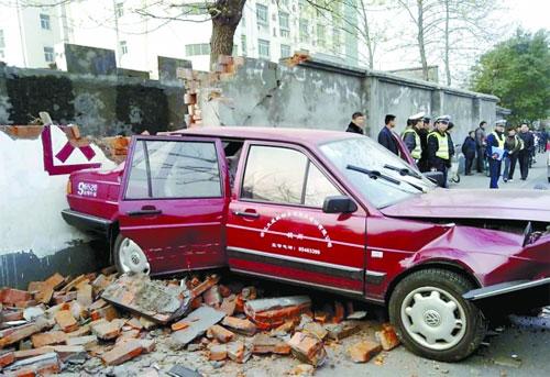 驾校训练场与路面落差有2米多高,这辆教练车接连冲破了围栏、隔离墩和围墙。 网友 王梓妈 本报记者 董旭明 摄
