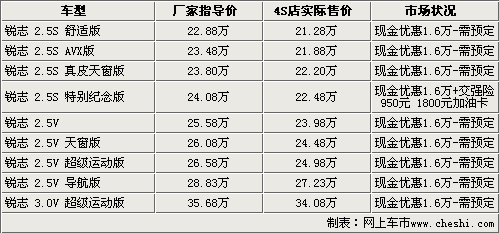 据一汽丰田4S店销售人员介绍,目前锐志全系车型都可以享受1.6万元的现金优惠,但是目前只有2.5S特别纪念版有现车销售,其它车型都需要提前预定。同时现在购买2.5S特别纪念版车型除可以享受到1.6万元的现金优惠外,还可以得到商家赠送的950交强险和1800元的加油卡,全都算下来优惠幅度将近2万元。如消费者有意购买,到店详谈会有更优惠的价格。北京地区各4S店由于订单不同,各店销售的现车颜色有所不同。