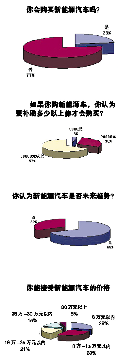 就新能源汽车目前的现状,记者向近100位读者做了调查,很多消费者在接受调查时表示,新能源车的技术还不成熟,但是目前的新能源车价格却很高,对于普通的消费者来说,还不如买一部普通的用油小车。