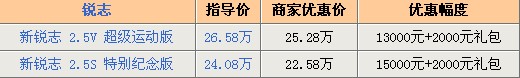 与皇冠共用底盘,发动机,同为6档手自一体的变速箱,这是锐志最大的亮点。虽然较小的车内空间一直让人诟病,但对操控性的执着依然得到不少车友的认可,销量与优惠幅度都比较稳定,现在主打的2.5S特别纪念版打出1.5万元的现金优惠,算是比较理想的价格,有兴趣的朋友可以考虑出手。
