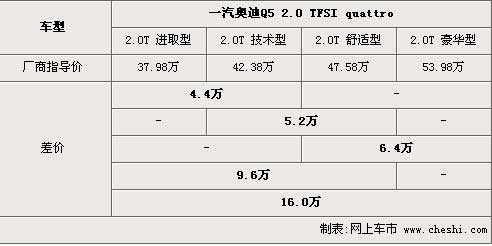 国产版奥迪Q5分为2.0T进取型、2.0T技术型、2.0T舒适型以及2.0T豪华型4款车型,售价区间为37.98-53.98万元。如上图所示,4款车型中的最低差价为4.4万元,而最高差价则高达16万元。