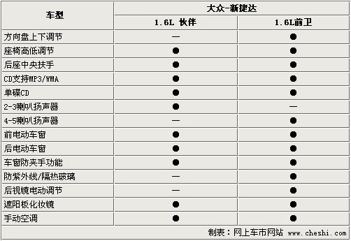新推出的两款车型保证了基本的舒适性及娱乐性,座椅高低调节及后排中央扶手提供了基本的配置。支持MP3/WMA的单碟CD音响方便了使用,两款车只是在喇叭数量上有所区别。全车标配电动门窗,对于捷达较低的价格而言也算难能可贵。但方向盘上下调节、防紫外线/隔热玻璃、后视镜电动调节在伙伴上并没有出现。可以看出,厂家对于这款经济型轿车的成本控制还是很严格的。