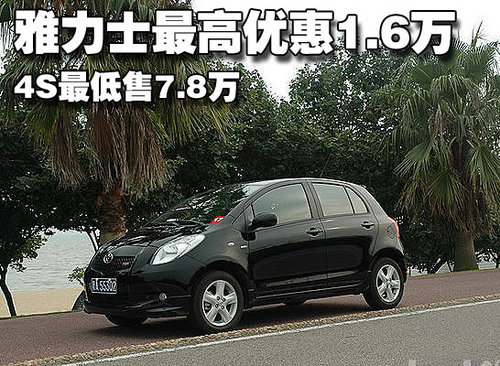 据广汽丰田4S店销售人员介绍,现在购买雅力士车型最高优惠现金1.5万元。低配车型优惠1.3万元,目前店内有至尊版现车供应,颜色以黑色、灰色为主,其它车型颜色需预订。如消费者有意购买,到店详谈会有更优惠的价格。北京地区各4S店由于订单不同,各店销售的现车颜色有所不同。
