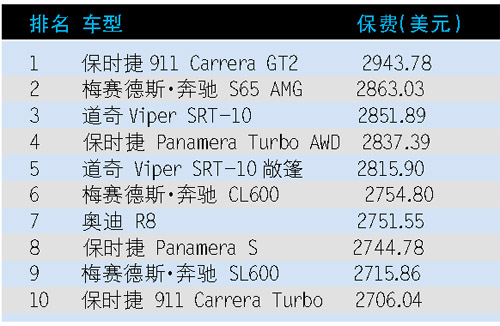 第一名跟第十名的保费差距大约也才只有240美金,而在前十名之后的11~20名中,基本上都是梅赛德斯·奔驰的天下,包括CL65 AMG、S600、SL65 AMG以及CL63 AMG都入选在内,除此之外,还有宝马M6(硬顶及敞篷版)和760i以及两款捷豹XKR机械增压版本。不过,文章并没有讲明保险金额的实际保障内容是什么,所以跟国内的保费也不太好比较。可是,可以看出,榜单中的这些车辆售价也并不便宜,这点儿保费还真不算什么。(记者陈鑫欣)