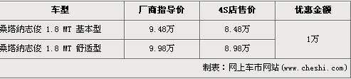 据上海大众经销商处销售人员介绍,桑塔纳志俊全系优惠1万元。桑塔纳志俊1.8 MT基本型经优惠后,售价从9.48万元下降到了8.48万元。售价为9.98万元的桑塔纳志俊经优惠后,售价降到了8.98万元。
