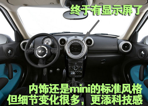 也许有些朋友会抱怨:mini的内饰的确个性,但是除了一副自动空调之外居然没有时下最为流行的车载显示屏。而我们通过这款最新的Countryman就看到了一些希望,在整体上依然是我们所熟悉的mini内饰之外,中控台中央最明显的变化就是那块彩色显示屏。