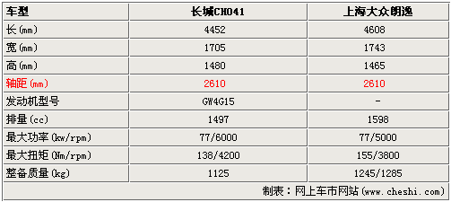 长城CH041车长4452mm、宽1705mm、高1480mm,在尺寸上虽然要比朗逸小一些,但作为车辆最重要的轴距上,两车同为2610mm,这也意味着CH041与朗逸不仅仅是外形相似那么简单。在动力上,CH041将搭载长城自主研发的1.5L CVVT发动机,具有可变节气门技术,在保证强劲动力输出的同时,又可以达到了良好的节油性能。