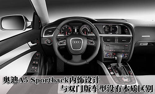 奥迪A5 Sportback四门轿跑车拥有与奥迪A系家族车型一致的内饰设计,最大的区别在于车厢布局上。银白色的金属装饰条和黑色防反光仪表板,突出时尚与动感的视觉效果,甚至在车顶和座椅的色彩选择上都采用了冷酷的黑色。