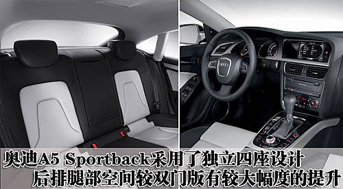 与很多四门轿跑车一样,奥迪A5 Sportback四门轿跑车采用了独立四座设计,前排提供运动座椅等选装配置,后排空间尤其是腿部空间表现较双门轿跑定位的奥迪A5有较大幅度的提升。