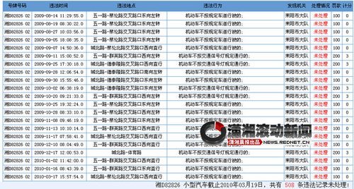记者登录衡阳市公安局交警支队的查询网站查证,从2005年4月15日始,“湘D82826小型汽车截至2010年3月19日,共有508条违法记录未处理”。违章行为主要是“机动车不按交通信号灯规定通行”、“机动车不按规定车道行驶”和“机动车违反规定停放、临时停车且驾驶人不在现场或驾驶人虽在现场拒绝立即驶离,妨碍其他车辆、行人通行”三项。该车罚款总数已累计达72800元,扣分累计660分。按规定,一年扣12分就要吊销驾照重考。这一辆车就扣了55个12分。