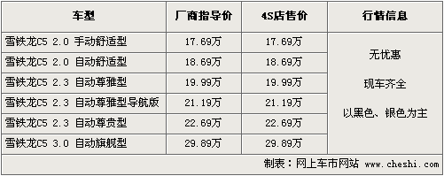 据东风雪铁龙4S店销售人员介绍,目前C5全系都有现车供应,主要有银色、黑色外观可选,部分车型颜色不齐全需要预定,订金为2000元-5000 元。同时4S店提供2.3排量试驾车共消费者体验。目前全系车型尚没有出现价格优惠,近期购买C5可赠送贴膜、脚垫等少量装饰。北京地区各4S店由于订单不同,各店销售的现车颜色有所不同。