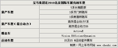 这次BMW在2010北京国际车展上,共将推出5款量产车型,其中包括3款汽车版车型,另外还将展示2款混合动力车型。这2款混合动力车型分别是高效混合动力X6与高效混合动力7系,它将传统汽油机与高效电动机完美组合,达到低排放、高效能的作用。另外3款量产车型我们都比较熟悉,新3系双门轿跑车、新3系敞篷轿跑车与5系长轴距版。如果说BMW混合动力车型只是为了展示未来技术及未来车型理念的话,那这3款汽油版车型着实离我们更近。