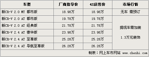 3月5日东风本田正式推出全新的CR-V,分为2.0L及2.4L两种排量,共计六款车型,售价18.98万元-26.28万元,比老款增加了导航版车型,新CR-V在配置方面更加完善。根据网上车市价格监测系统显示,全新上市的CR-V目前加价数额与3月基本相同,提现车需加装1.3万元装饰。具体车型售价见下表: