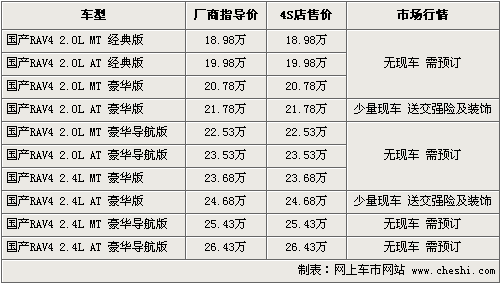 受丰田“召回门”的影响,RAV4持续的加价现象已经不复存在。据一汽丰田4S店销售人员介绍,目前丰田RAV4购车可 获赠交强险,并且还赠送千元的装饰礼包,装饰包括:贴膜、脚垫、坐垫等可供消费者选择。现车方面不太齐全,2.0L只有豪华版有少量黑色现车,2.4L有 豪华版银色、黑色等现车供应,相比前段时间现车供应紧张的状况,目前的供货慢慢趋于缓解。行情信息多变,请以当日行情为准。
