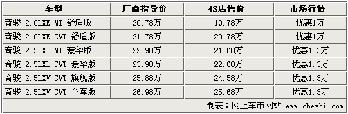 据北京地区东风日产4S店销售人员介绍,目前奇骏2.0车型可以优惠现金1万元,优惠后入门级车型售价跌入了20万元价格区间,售价仅为19.78 万,就是货源相对比较紧张,订货周期在10个工作日左右。而2.5排量车型的货源就相对比较充足,优惠幅度也比较大,达到了1.3万元。另据4S店销售人员介绍,奇骏全系车型中只有高配车型带导航和行李架,用户购车同时可以根据需要加装相应的配置,经销店内也有相应的套餐可供选择,价格在1.2-1.6万元之间。