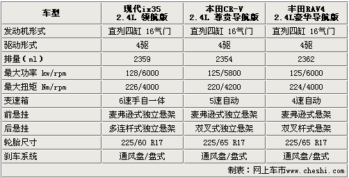 在动力性方面,虽然这三款车均搭载了2.4L排量的发动机,但是新上市的北京现代ix35的最大功率及最大扭矩的输出要比另外两款车更加出色。另外这三款车驱动方式上都采用了四驱,对于雨雪天气及恶劣路况的行驶起到了稳定安全的作用。在变速箱方面,北京现代ix35采用了同级别车型中很少见的6速手自一体变速箱,不仅在换挡平顺,而且更加省油。