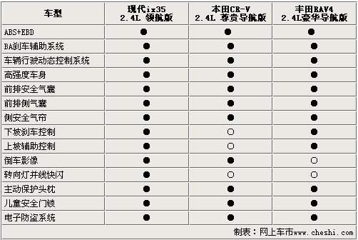 在安全性方面,这三款车均配备了前排双气囊,侧气囊、侧气帘等被动安全装置和ABS、EBD、车身动态稳定系统等主动安全装置。不过北京现代ix35和丰田RAV4还装备了上坡辅助系统及陡坡缓降系统,为挑战陡峭路段及新手坡起提供了方便的操作。除RAV4外,另外两款车配备了倒车影像系统,在停车入位时,消费者可以更加从容的操控车辆。