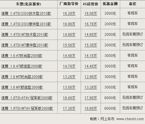 自来势汹汹的速腾1.4TSI车型于9月份上市以后,一汽大众旗下主打紧凑车市场的速腾车系队伍再次得到了扩大,同时也得同级竞争车型带来了强烈的竞争。近日据了解,速腾全系最高优惠6000元,并且1.4TSI车型也出现了2000元的优惠,具体车型价格详情请看下表: