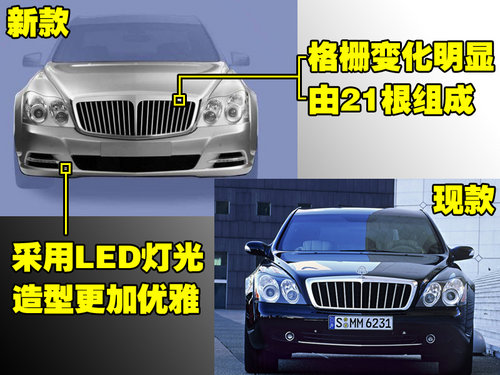 迈巴赫的中期改款设计图片上可以看出,迈巴赫改款车型拥主要变动在于前脸,加入了LED日间行车灯设计。除此设计图外曝光外,迈巴赫的中期改款车型确定将于北京车展全球首发。迈巴赫改款车型采用了全新的进气格栅设计,较现款车型的视觉效果更加硬朗。迈巴赫改款车型的保险杠造型也有所改变,原本通栏式设计被现款三栏式设计所替代。此外,原本保险杠两侧的圆形雾灯,也被LED日间行车灯所取代。由此可以看出,迈巴赫改款车型在设计上融入更多的奔驰元素。