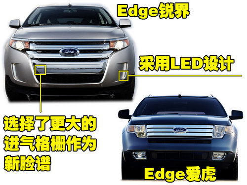 全新车型锐界相比爱虎,仍采用硬朗、大气的车身线条,只是在细节方面有着较大区别。前脸部分选择了更大的进气格栅作为新脸谱,但仍选择镀铬式进气格栅。雾灯采用了非常时尚的条形LED设计,竖条状的设计令新款Edge极具个性。