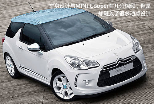 初次看到DS3时会有眼前一亮的感觉,然后细细端详我们能看到车身设计与MINI Cooper有几分相似,但是却融入了很多动感设计,搭配上与WRC战车相似的合金轮毂,很有小型战车的感觉。