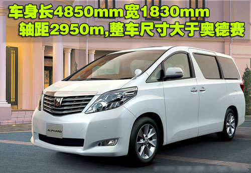 目前日本本土销售的丰田Alphard是其第二代车型,分为两驱和四驱两个版本,两驱车型的车身长4850 mm ,宽1830 mm ,高1890mm,四驱车型的车身长为4850 mm ,车宽1830 mm ,高1905mm,而轴距均为2950mm。