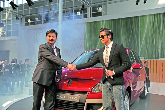 车展媒体日首日,郭富城就亲临雷诺展台,与雷诺大中华区执行总裁陈国章一起,为雷诺新风景的亚洲首发揭幕。因为天王的到来,雷诺展台近百名保安及警察如临大敌,严格限制入场媒体,未获邀请的一律被请出现场。本报记者早早来到雷诺展台,抢占有利地形,拍下了天王风采。