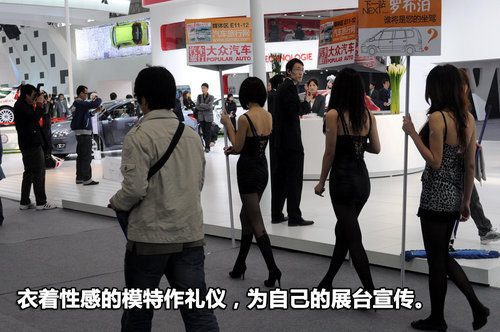 这届车展每个品牌都努力的让参观者来关注自己,奔驰派出了一水的外国美女举着牌子在展馆里不断的走动,有些人则用一些衣着性感的礼仪,总之能吸引眼球的方法厂家都想到了,而效果自然不会差。
