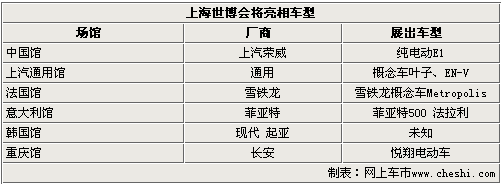 在本次世博会上,中国馆中将展出上汽荣威推出的纯电动车E1,这款车在本届北京车展中已经正式亮相,预计将在2012年正式实现量产。在通用馆展出的EN-V日前已在上海以全球首发的身份亮相,由于造型不同他们分别被命名为“骄”、“妙”和“笑”。这款双人座EN-V电动联网车创新地融合了电气化和车联网两大技术,从而实现未来城市交通零油耗、零排放、零堵塞和零事故。其余将亮相的车型还包括雪铁龙全新概念车Metropolis、菲亚特500、法拉利和长安悦翔电动车等。