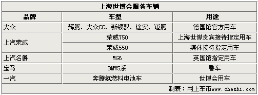 除了在展馆内展出的新车,各大汽车厂商也对组委会和场馆提供了服务用车。自2008年成为北京奥运会官方用车合作伙伴之后,大众汽车在即将开幕的2010年上海世博会中,成为德国国家馆官方用车合作伙伴,将顶级豪华轿车辉腾等6辆官方用车正式交付给上海世博会德国国家馆。上汽荣威旗下的荣威750和550则成为了世博会贵宾指定用车和媒体制定用车。宝马公司则提供的22辆530Li轿车将纳入交警总队警务开道车队,为世博会期间迎送贵宾担负起安全保障工作。