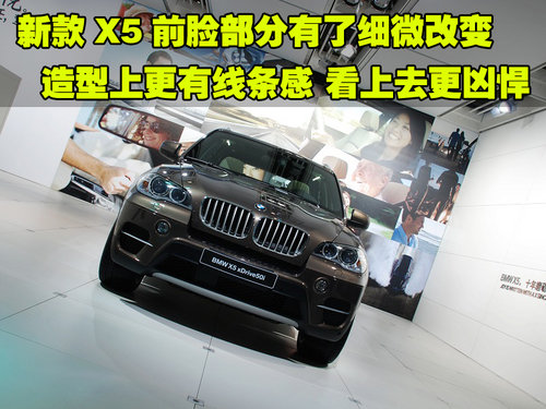 BMW新款X5在前脸部分相比现款有了细微的调整,从上面图片上来看可以看出在前保险杠的整体造型上更有线条感,看上去更凶悍。保险杠两端“进气口”式的造型相比现款车型来说更大视觉效果更加凶悍。