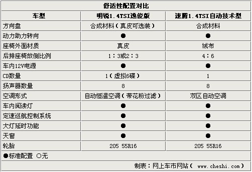 总体而言,新明锐1.4TSI逸俊版与速腾1.4TSI自动技术型在配置水平上旗鼓相当,两者只是设计取向有所不同。尤其在舒适性配置上,新明锐比速腾多出真皮座椅,但速腾配备了新明锐所没有的双区自动空调,至于哪一个更重要,没有一个公正的选择标准,这只能根据消费者的爱好和使用情况而定。希望通过这篇文章,让您有一个明确的选择对象。