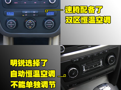 舒适性配置上,新明锐同样可以自由选择。譬如方向盘,新明锐可选择真皮材质,如果选择标配,即和速腾相同同为合成材料。但有部分配置是固定的,譬如新明锐的真皮座椅和速腾的绒布座椅,并不能进行选择,这也是两者配置不同的其中一点;还有在空调配备上,新明锐选择了自动恒温空调,而速腾选择了双区自动空调。双区自动空调可按照左右两端自动调节空调温度,要比自动恒温空调更为先进和人性化。