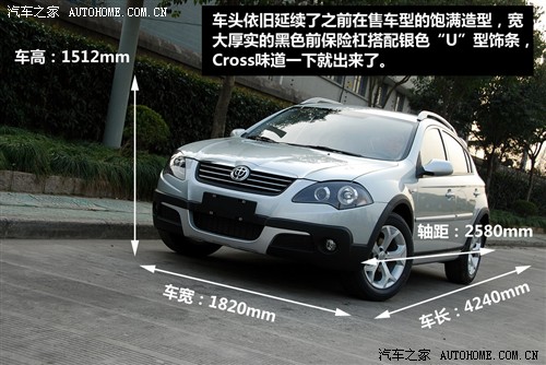 骏捷Cross的车身尺寸为4240mm×1820mm×1512mm,轴距依然为2580mm,与原型车骏捷FRV相比,除了底盘升高了20mm之外,中华骏捷Cross加装了前后大包围,标配的全铝制车顶行李架和蜂窝状的进气格栅增加了动感和活力,轮毂由FRV的15寸升级为16寸的铝合金轮毂,在增强视觉效果的同时,也使档次得到一定提高。