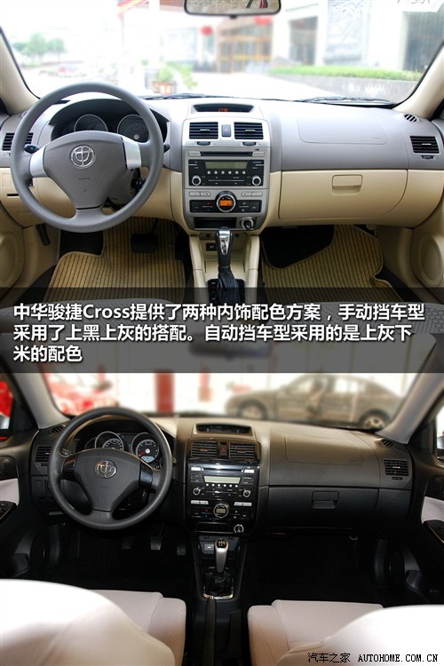 与个性的外观相比,骏捷Cross在内饰上似乎并没有体现出什么特点,呈现的一派典型的轿车化风格,做工在自主品牌里面算是比较出色的,而且样式也绝对不亚于同价位的合资车型,其中手动挡车型采用的是上黑下灰的配色方案,而自动挡车型则为更接近结局的上灰下米的色彩搭配。