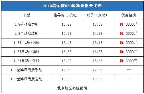 近日,编辑从北京地区上汽汽车4S经销商处了解到,荣威550全系车型的现车比较充足,购车可以优惠3000元左右。据经销商介绍,在春节期间推出的荣威550贺岁版在世博会到来之际改名为“世博风尚版”继续销售,因为贺岁版车型的性价比较高,没有大幅度的现金优惠。店内销售人员介绍,如果不需要现金优惠,消费者在店内可获赠世博版大礼包,有机会免费参加上海世博会。