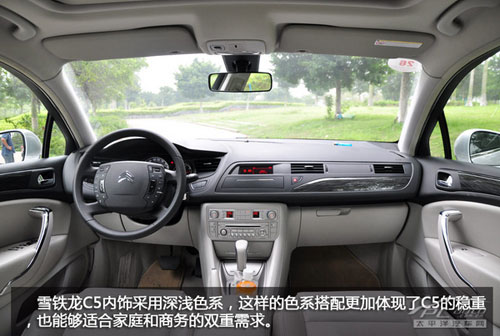 在内饰的设计风格上雪铁龙C5延续了外观的风格内敛沉稳,内饰采用深浅色系风格搭配,能够适合家庭和商务的双重需求,用料材质上不错,做工也比之前入华车型有了很大提升,多功能的中央集控式方向盘设计要优越新君威,在实际使用过程中也是很人性,不过适应这种法国式的浪漫依然需要一定的时间,而仪表盘可观性不如新君威。但太空舱式风格,提高了掌控感。