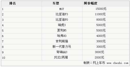 随着国内汽车市场逐渐升温,很多汽车品牌也开始了市场争夺战,很多热门车型在进入五月份以来,都出现了较大的优惠幅度。据网上车市网站了解,很多自主品牌热门车型在北京汽车市场已经开始出现了初步的价格战,比如比亚迪F3、MG7等热门车型都出现了万元以上的优惠幅度。这对很多消费者来说算是个比较好的消息,接下来让我们去了解一下究竟有哪些车型优惠幅度最多。