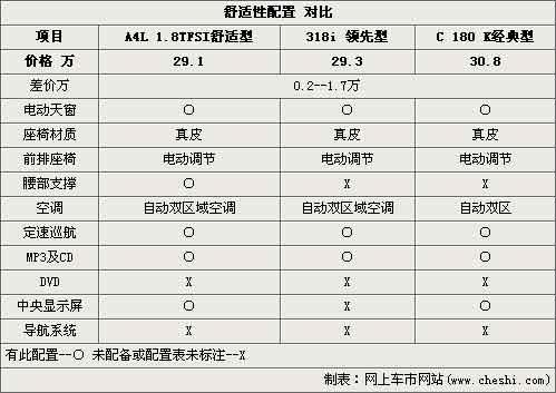 为了让驾驶变得更轻松让旅程变得更惬意,高端轿车一般都会具备较为全面的舒适娱乐设施。这三款车型基本上都是车系的入门产品,因此在配置上豪华型有所欠佳,实用性上也全部没有配备GPS导航系统和DVD播放功能。不过3款车型均把一触式防夹车窗、4门一触式车窗、CD机作为了标准配备,进一步丰富了整车的功能性和娱乐性。其中奥迪A4L还提供了中央显示屏以及双区域的自动恒温空调,应该说是更为细致入微的。