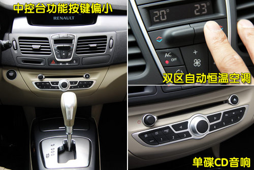 中控台中细小的按键不知道法国人何时能够为此改变一下,想当初进入到C5车内时,被琳琅满目的小按键搞的晕头转向,并且在驾驶时我是不敢随意去触碰那个区域的。不过还好拉古那中控台按键并不是很多,空调区域的造型很时尚,也很节省空间,实际操作也非常容易上手,调节方式也很简便。另外老款的拉古那配备的是多碟CD,而新款车型装配的则是单碟CD音响,在日常使用中,多少会有一些不便。