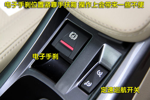 电子手刹的位置位于手扶箱前侧,实际操作中按照正常坐姿会感觉到有一些不便,但该功能在使用中比较便利,按键阻尼的手感也比较适中,并且电子手刹的配置确实非常实用。在电子手刹旁则是定速巡航系统的开关键,这与前段时间评测的科雷傲相同,同样在使用中会感到一些不便,我甚至在想,为什么不能把这个功能都整合到方向盘中呢?