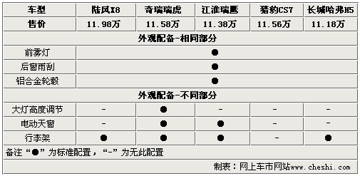 外观方面,五款车均配备了独立设计的前雾灯、后窗雨刷和铝合金轮毂。而奇瑞瑞虎还配备了大灯高度调节功能,其他车型并未装备。瑞虎、瑞鹰还为大家配备了更贴近家庭使用的电动天窗,虽然天窗的实际使用率并不高,但是偶尔使用也是很惬意的。除了猎豹CS7,其余4款车都配备了车型行李架,为出行载物提供了不少的便利。