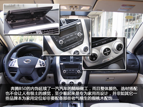 正如开始说的,一汽汽车制造真的是一个噱头,因为一汽所出品的轿车一般做工都非常精细,这是绝大部分一汽汽车用户所承认的,而且毕竟是一款更趋向于年轻人的紧凑型轿车,所以B50并没有使用桃木内饰装扮,配合镀铬的配饰,其内部看起来更加的年轻。