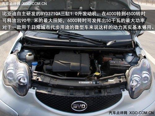 比亚迪F0搭载的是自主研发的BYD371QA直列三缸全铝发动机,号称“史上最强全铝发动机”,搭配BYD5T-09的5档手动变速箱,可输出50kW/6000rpm的最大功率,在4000~4500转时能输出最大扭矩90Nm,动力输出偏高转速。
